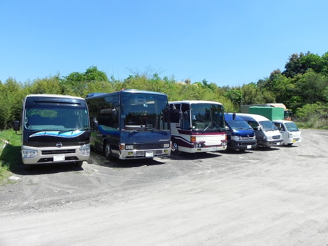 弊社には、10人乗り(1台)、15人乗り(1台)、2トンコンテナ車(1台)、3.5トンユニック車(1台)、軽トラック(1台)がございます。